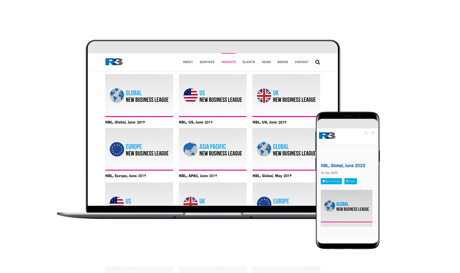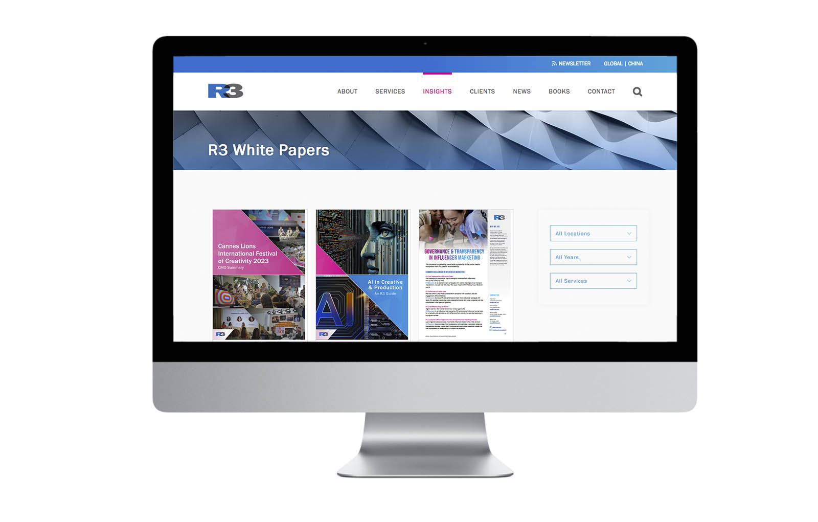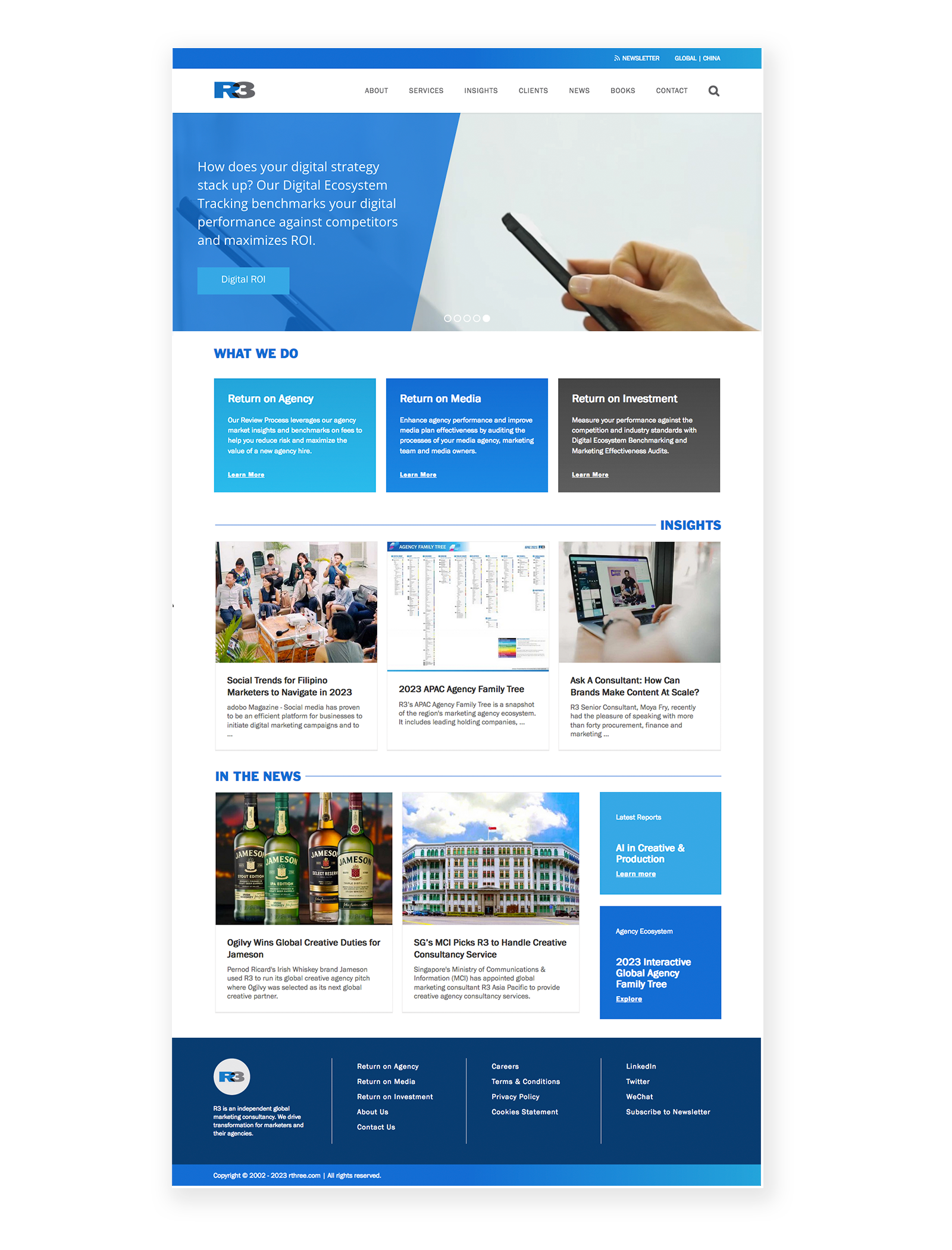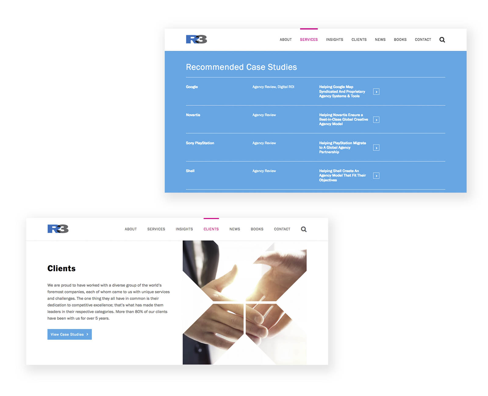 Solution: The redesigned website became a comprehensive catalog of R3’s offerings, including service overviews and case studies, quarterly reports, infographics, and publications, articles, interviews with marketing leaders, and news updates