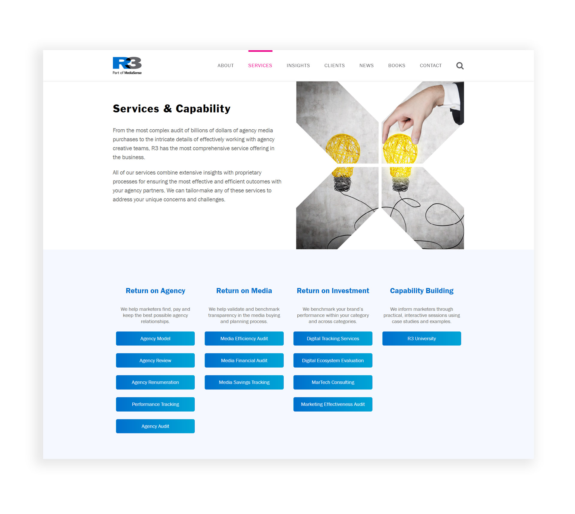 Overview: I was tasked with redesigning R3's website, to better reflect the breadth and value of their evolving services. R3 is an independent marketing consultancy. The goal was to transform their website from a basic informational site into a dynamic, content-rich hub for clients and the marketing community.
