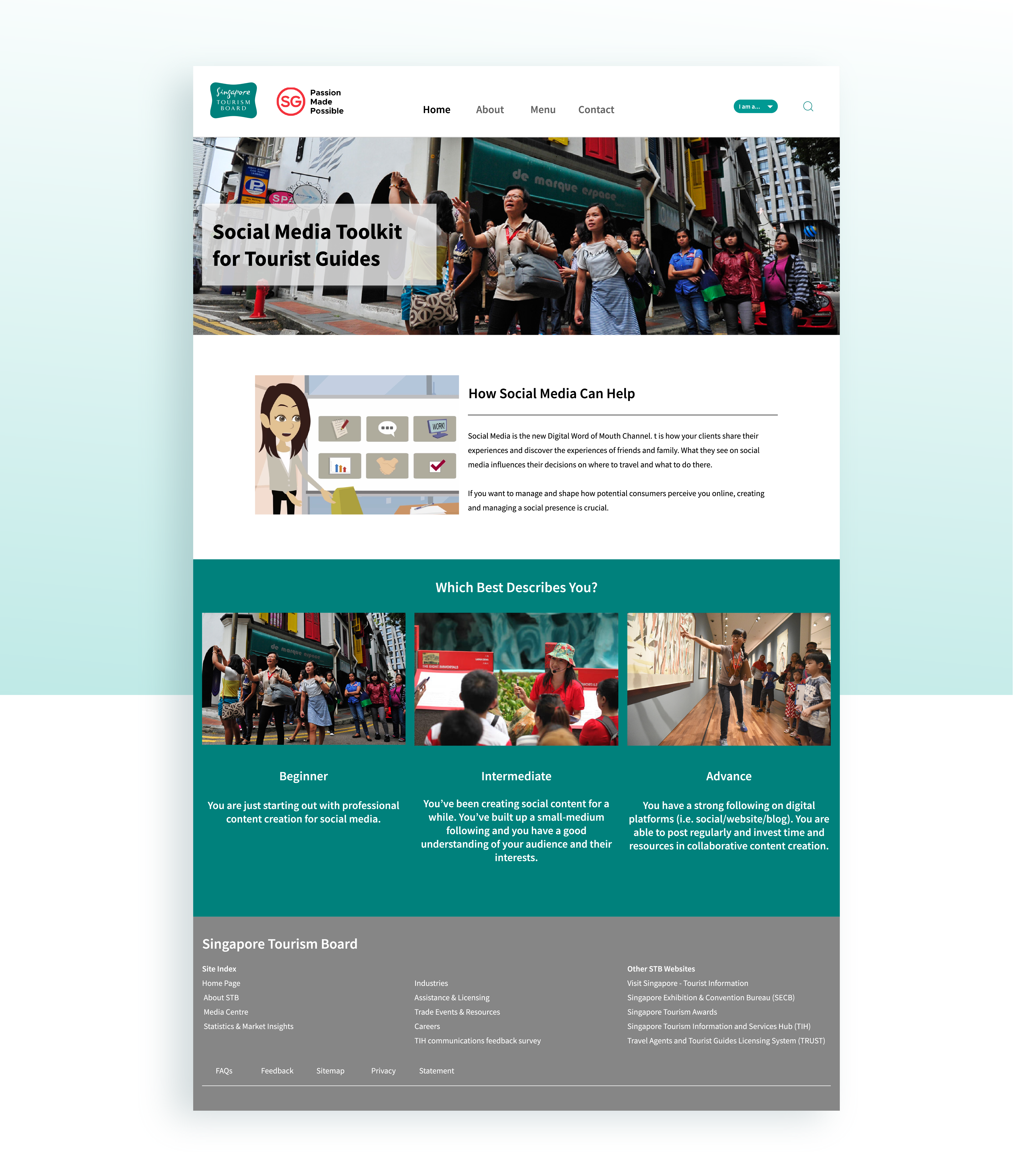 Overview: The Social Media Toolkit for the Singapore Tourism Board (STB) was designed to help Singapore’s tour guides—primarily aged 50 and above—become more tech-savvy and leverage social media to promote their services. With an average age of 58, many of the guides struggled to adapt to the growing demands of tech-savvy tourists. The toolkit aimed to provide a simple, accessible way for them to engage and reach a wider audience.